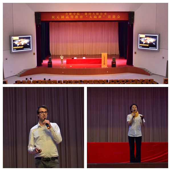 919-20日,為做好合肥學院·德國大陸公司雙元制高等教育“大陸班”的宣傳招生工作,我校特邀請德國大陸集團合肥公司于我校致用禮堂舉辦兩場雙元制高等教育“大陸班”宣講會。宣講會由教務處、國際交流合作處主辦,我校副校長劉建中、大陸馬牌輪胎(中國)有限公司人力資源總監孫怡等應邀出席,機械工程系、電子信息與電氣工程系、計算機科學與技術系、化學與材料工程系、生物與環境工程系、建筑工程系全體2016級(非中外合作專業)新生參加。