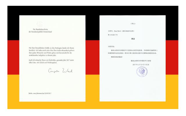 這是學校第3次收到默克爾總理親筆信。此外,學校還收到時任德國總統伍爾夫先生2次親筆信。