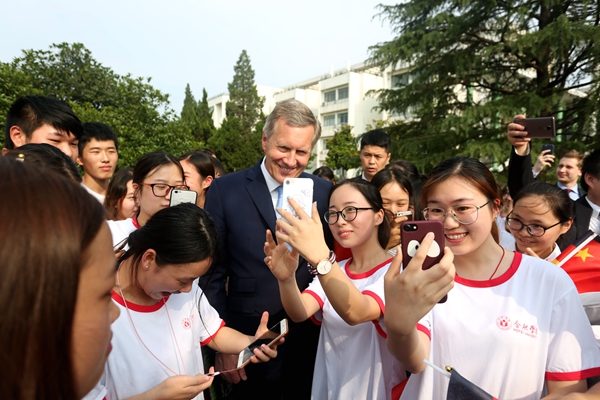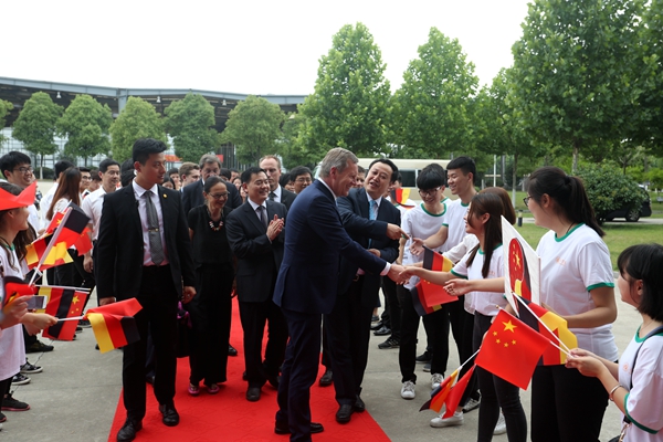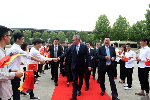 6月19日下午,充滿熱情和期盼的學生們站立在合肥學院圖書館報告廳大門兩側,手持中德兩國國旗熱烈歡迎武爾夫先生的再次到來。一路上,武爾夫主席多次駐足與師生代表親切交流。