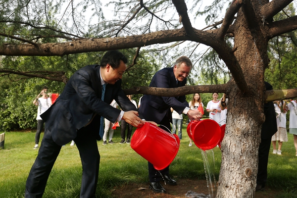 活動現場播放了武爾夫歷次訪問我校的視頻,為武爾夫慶祝生日并合唱獻花,氣氛熱烈。最后,武爾夫主席一行來到一期中德友誼樹前,踏過紅地毯,從等候在這里的合肥學院學生手中接過盛滿中德友誼和希望之水,將水澆向2005年第一次來合肥學院時親手栽下的友誼樹。據悉,武爾夫曾兩次訪問合肥學院,2005年5月,武爾夫在合肥學院種下了一棵象征中德友誼的常青樹——雪松,2008年10月在任德國下薩克森州州長時訪問安徽,再次來到我校進行訪問。九年來,友誼之樹茁壯成長,武爾夫先生是合肥學院全體師生最值得尊敬、最值得驕傲的德國友人。