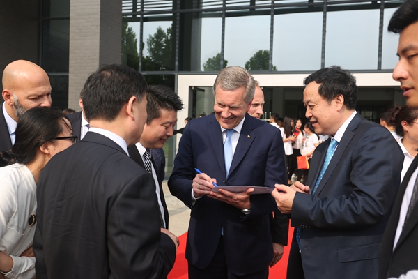 合肥學院黨委書記蔡敬民為武爾夫主席頒發了合肥學院“榮譽教授”聘書,武爾夫主席為中德教育合作示范基地六大平臺之一的“中德青年創業孵化中心”揭牌,全球中小企業聯盟秘書長曹方、中國人民對外友好協會亞歐部部長沈昕、安徽省教育廳廳長李和平、安徽省人民政府外事辦公室副主任張力芳等陪同揭牌。他們共同見證了蔡敬民與全球中小企業聯盟秘書長曹方先簽署雙方戰略合作協議,同時也見證了全球中小企業聯盟秘書長曹方與全球中小企業聯盟德國、瑞士、奧地利區執行主席邁克爾·皮茨簽署全球中小企業聯盟歐洲辦公室協議。