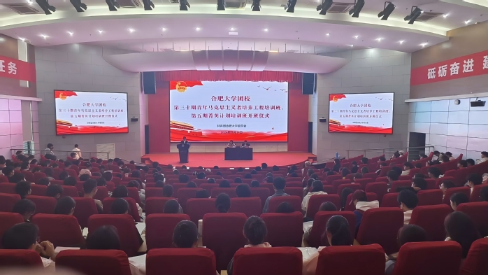 11月14日,合肥大學團校第三十期青年馬克思主義者培養工程培訓班、第五期菁英計劃培訓班于圖書館報告廳A廳舉行開班儀式。馬克思主義學院副院長蘇冰、校團委副書記李妍妍等參加儀式。