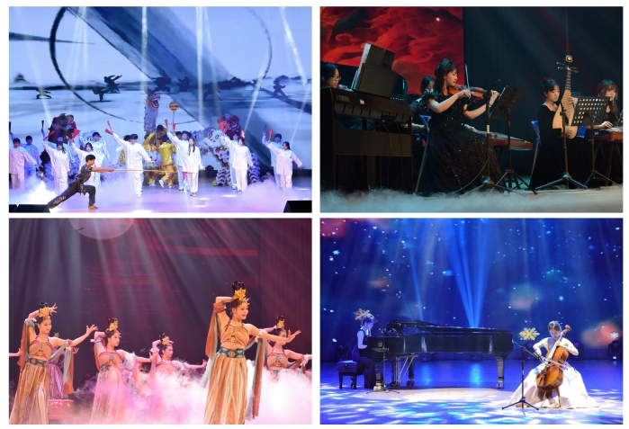 《龍獅獻瑞武華章》將禮堂的氣氛瞬間點燃,晚會正式拉開序幕。器樂合奏《云宮迅音》、舞蹈《無畏少年》生動展現了時代青年的新力量,鋼琴獨奏《張帥三首前奏曲之三》、大提琴獨奏《冬的浪漫》、琵琶獨奏《送我一支玫瑰花》,優美的旋律讓人陶醉其中。敦煌舞《沁蓮》帶領觀眾感受敦煌藝術的無限魅力,領略傳統文化的生生不息……