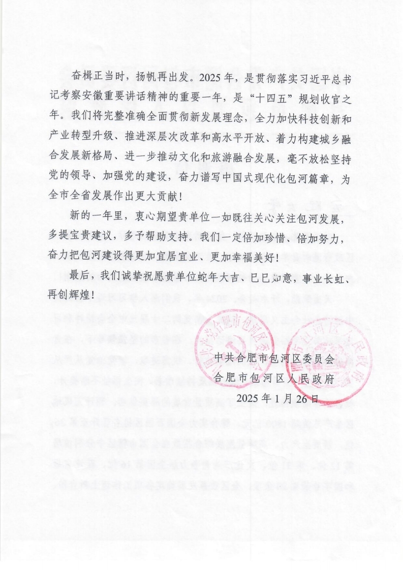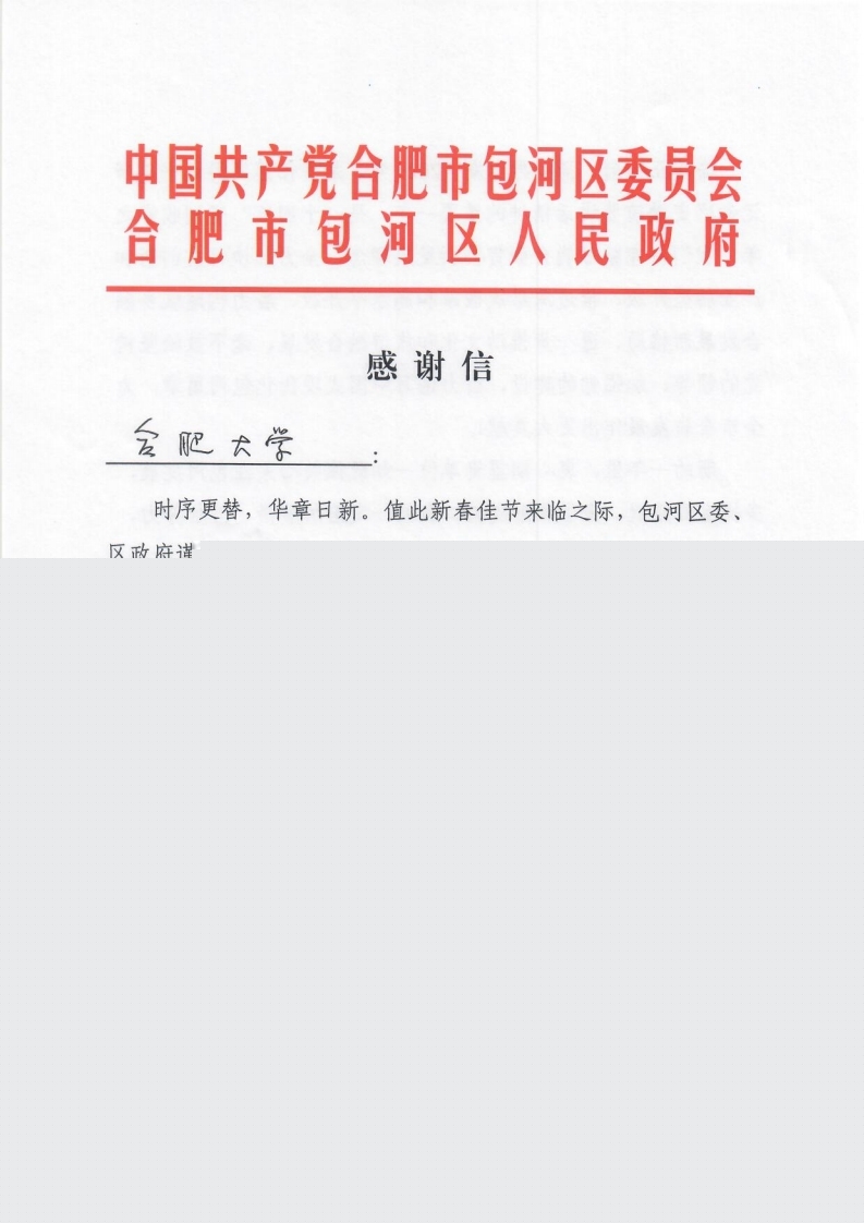 正值歲末,我校收到了來自合肥市包河區(qū)委區(qū)政府發(fā)來的感謝信。信中,包河區(qū)委區(qū)政府對我校給予包河區(qū)的關(guān)心幫助致以衷心感謝。