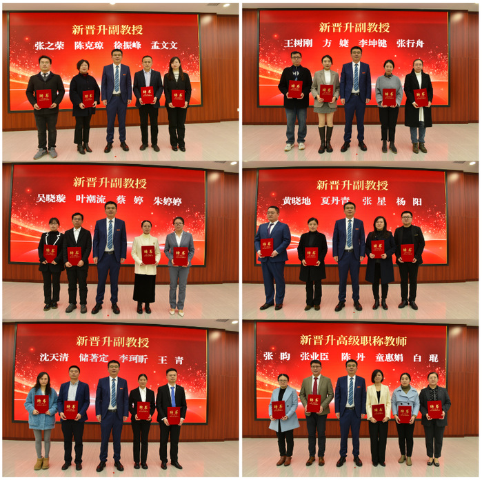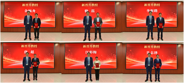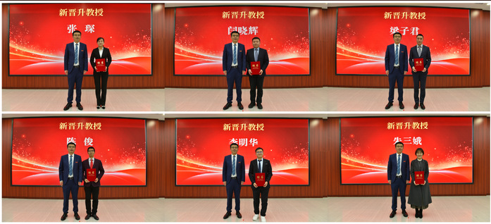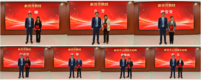 聘任儀式上,校黨委副書記周飛宣讀2024年度新晉升高級職稱教師聘任文件。任永逐一為新晉升高級職稱教師頒發(fā)聘任證書并合影留念。