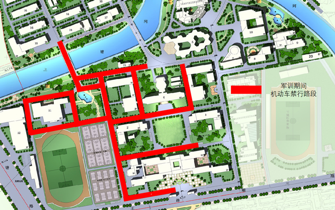1.體育館、游泳館、室外籃球場(chǎng)、新教樓、師生活動(dòng)中心周邊道路,存中樓中心廣場(chǎng)周邊等區(qū)域作為學(xué)生軍訓(xùn)場(chǎng)地,禁止機(jī)動(dòng)車(chē)停放和通行。