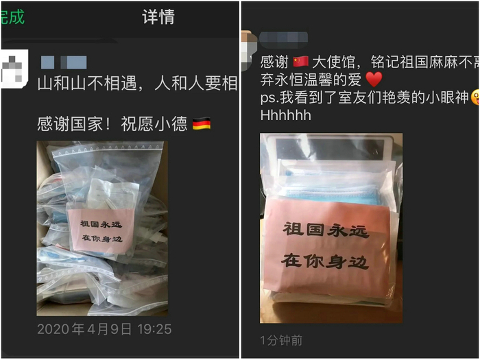 “愛心防疫包”包含N95口罩兩只、醫用外科口罩兩盒共二十只、表面消毒巾一包及《新冠防疫知識問答手冊》一份。在德國市場防疫物資相對匱乏的時刻,這份母愛顯得尤為珍貴。同學們在網上和朋友圈紛紛曬出圖片,表達對祖國溫情的感激,對使領館、在德物資提供企業及學聯工作人員奉獻愛心辛苦工作的感謝,并衷心祝愿祖國繁榮昌盛,祝福德國早日走出疫情的陰霾!