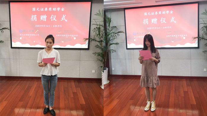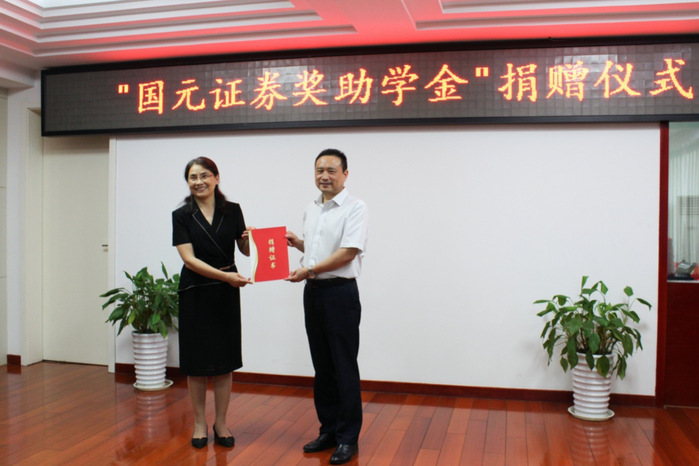陳秀對國元證券長期以來支持合肥學院教育事業發展以及關愛學生成長的善舉表示衷心感謝,對國元證券在安徽省內多個高校設立獎助學金,積極履行社會責任,關心安徽教育事業發展的公益行為高度贊揚,并向獲得“國元證券獎助學金”的同學表示熱烈祝賀。她希望“國元證券獎助學金”的慈善事業在合肥學院一直持續不斷地進行下去,讓更多的學子感受企業的社會責任,讓更多的學子今后走上社會也能傳承愛心,傳遞善意。
