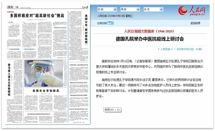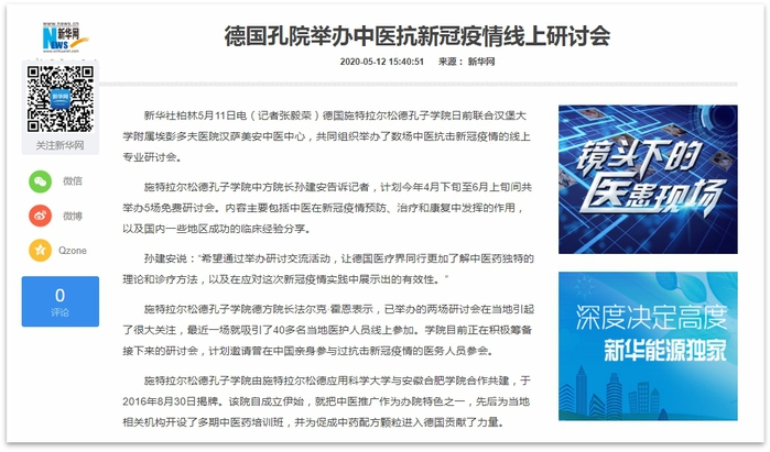 此次疫情同時在歐洲多國肆虐,目前德國醫(yī)療系統(tǒng)承受著巨大的壓力,在進一步相對有效控制住本國疫情的同時,還接收了大量來自法國、意大利等鄰國的重癥患者。中醫(yī)藥及中西醫(yī)結(jié)合診療在中國的成功經(jīng)驗,也獲得了德國醫(yī)療專業(yè)人士的廣泛關(guān)注。借此契機,合肥學(xué)院在德國施特拉爾松德共建的施特拉爾松德孔子學(xué)院聯(lián)合德國漢堡大學(xué)附屬埃彭多夫醫(yī)院漢薩美安中醫(yī)中心,共同組織舉辦了數(shù)場中醫(yī)抗擊新冠疫情的線上專業(yè)研討會。按照計劃,從4月下旬至6月上旬間共計舉辦5場免費研討會,內(nèi)容主要包括中醫(yī)藥在此次新冠疫情預(yù)防、治療和康復(fù)中發(fā)揮的作用,以及中國國內(nèi)一些地區(qū)成功的臨床經(jīng)驗分享。施特拉爾松德孔子學(xué)院中方院長孫建安表示,希望通過舉辦研討交流活動,讓德國醫(yī)療界同行更加了解中醫(yī)藥獨特的理論和診療方法,以及在應(yīng)對這次新冠疫情實踐中展示出的有效性。施特拉爾松德孔子學(xué)院德方院長法爾克·霍恩教授表示,已舉辦的兩場研討會在當?shù)匾鹆撕艽箨P(guān)注,最近一場就吸引了40多名當?shù)蒯t(yī)護人員線上參加。學(xué)院目前正在積極籌備接下來的研討會,計劃邀請曾在中國親身參與過抗擊新冠疫情的醫(yī)務(wù)人員參會。
