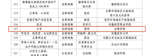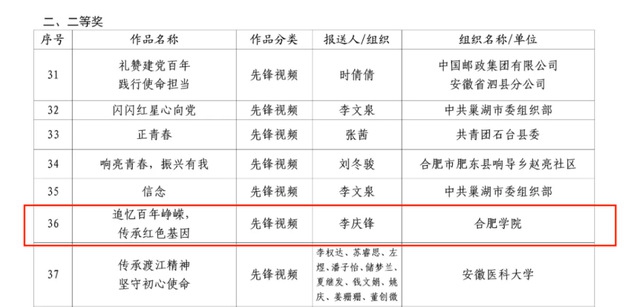 11月30日,中共安徽省委組織部、共青團安徽省委、安徽省學生聯合會在全省青年黨團員中開展的“青春心向黨,百年正芳華”紅色信息征集評選活動結果公布,我校參賽作品獲得二等獎1項,三等獎1項。