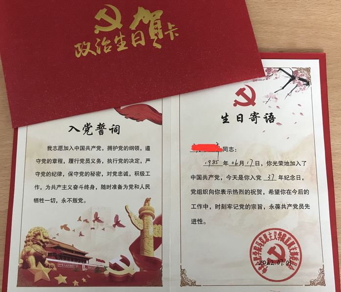 參觀后,馬克思主義學(xué)院直屬黨支部為每位黨員頒發(fā)了定制的政治生日賀卡,開展集體過(guò)政治生日活動(dòng),全體黨員在莊嚴(yán)的黨旗下,重溫入黨誓詞,充滿儀式感的政治生日賀卡和寄語(yǔ),錚錚入黨誓詞,讓每位黨員牢記初心使命,增強(qiáng)了黨員的歸屬感、榮譽(yù)感和責(zé)任感。