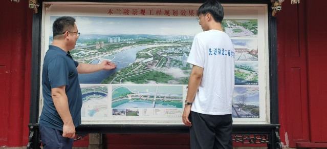 圖為當地工作人員向調研成員介紹木蘭坡防洪構造
