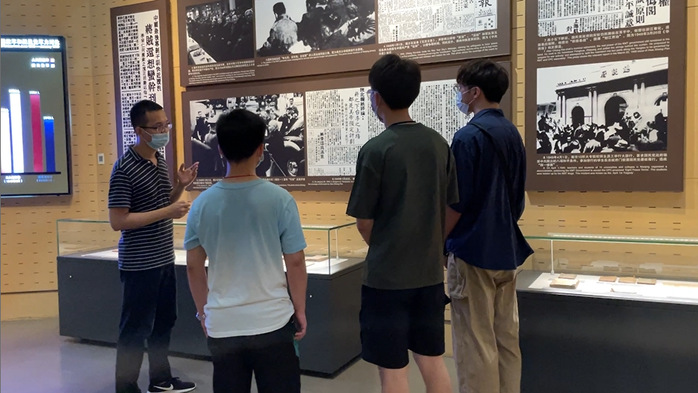圖為帶隊老師威力旺在為調研成員講述渡江戰役故事