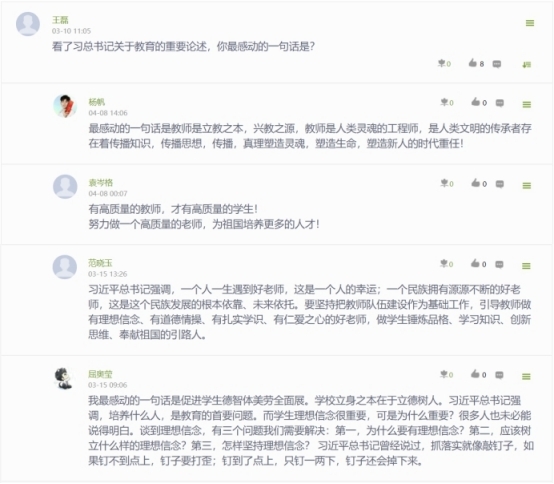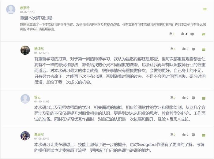 提升教學(xué)反思能力。培根鑄魂,啟智潤心。教學(xué)是一個(gè)長期動(dòng)態(tài)過程,需要教師不斷地反思并且持續(xù)地推進(jìn)育人觀念和育人方式,最終實(shí)現(xiàn)育人真諦。為進(jìn)一步鞏固學(xué)習(xí)成果,數(shù)學(xué)與統(tǒng)計(jì)系評選出優(yōu)秀“踐行師德”學(xué)習(xí)反思報(bào)告、優(yōu)質(zhì)簡歷及GeoGebra優(yōu)秀作品,引導(dǎo)學(xué)生重溫研習(xí)過程、觀摩優(yōu)秀作品、相互借鑒學(xué)習(xí)。學(xué)生們在學(xué)習(xí)通平臺(tái)上點(diǎn)贊本次活動(dòng)之余也紛紛發(fā)表心得感悟,折射出他們對教師職業(yè)生涯規(guī)劃和教學(xué)方法的思考。院系將同學(xué)們的意見收納整理,以便于對研習(xí)設(shè)計(jì)的不足加以改進(jìn)。