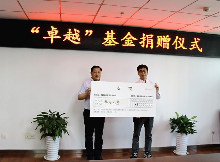 捐贈儀式上,雙方簽訂捐贈協議。汪若逸代表卓越設計教育安徽校區向基金會遞送捐贈支票。何世昆代表基金會向卓越設計教育安徽校區頒發捐贈證書。