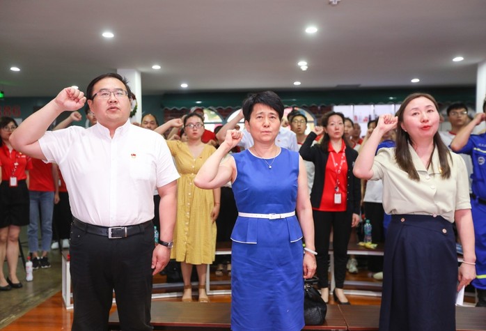 劉曉冬帶領黨員們重溫入黨誓詞:“我志愿加入中國共產黨,擁護黨的綱領,遵守黨的章程,履行黨員義務,執行黨的決定……”館內,黨員們高舉右拳,在黨旗前宣誓,聲音久久回響。