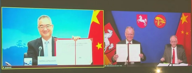 王清憲與魏爾線上簽署了《中華人民共和國安徽省人民政府與德意志聯(lián)邦共和國下薩克森州政府關(guān)于進一步深化友好省州關(guān)系合作意向書》并互贈禮品。