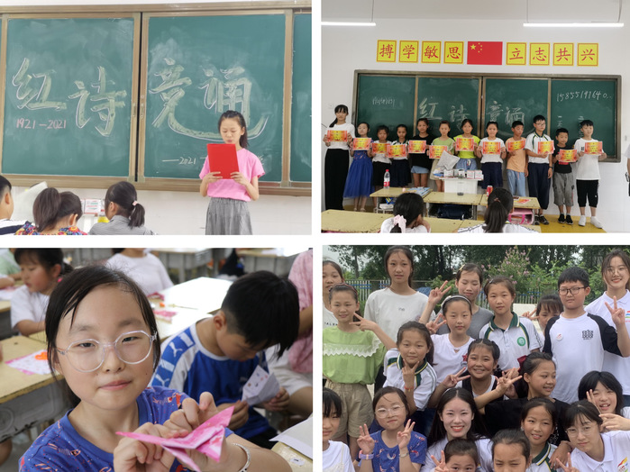 “大哥哥大姐姐們給我們講課,帶我們做游戲,讓我們學(xué)到了好多知識(shí)。我一定要努力讀書(shū),爭(zhēng)取上大學(xué)。”六年級(jí)學(xué)生張思穎興奮地說(shuō)。在為期7天的實(shí)踐活動(dòng)中,愛(ài)心支教組走進(jìn)鄉(xiāng)村為當(dāng)?shù)貎和_(kāi)設(shè)藝術(shù)文化課、黨史文化課、紅歌音樂(lè)課、巧手繪畫(huà)課等,向小朋友們講授各類(lèi)知識(shí),點(diǎn)燃他們渴望成才的夢(mèng)想。課程結(jié)束后,支教組隊(duì)員吳狄感慨道:“希望孩子們能夠養(yǎng)成熱愛(ài)學(xué)習(xí)、自覺(jué)學(xué)習(xí)的好習(xí)慣,從小就熱愛(ài)祖國(guó),心懷理想,成長(zhǎng)為一個(gè)有愛(ài)、有夢(mèng)想、全面發(fā)展的人。”隊(duì)員們不單單在課堂上認(rèn)真授課,課下還抓住一切時(shí)間與孩子交流互動(dòng),走進(jìn)他們的成長(zhǎng)環(huán)境,通過(guò)心靈的交織搭起溝通的橋梁,努力在孩子們的心里播撒下希望的種子。
