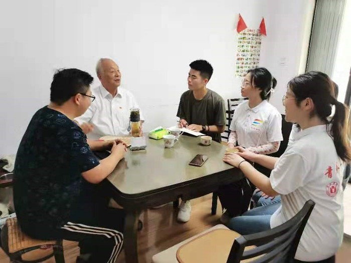 7月22日,在南艷湖居民區黨群服務中心王書記的帶領下,合肥學院教育學院“青春向黨,‘育’你同行”團隊的黨員們來到89歲的抗美援朝老兵張振行家中。