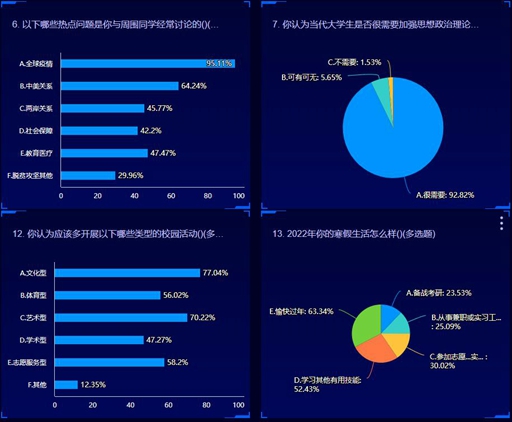 三月中旬,學工部面向全體在校學生開展春季學期思想動態(tài)問卷調(diào)查,實際發(fā)放網(wǎng)絡問卷近13000份,回收有效問卷8940份。問卷圍繞思政教育開展、時政熱點關注、國際國內(nèi)形勢變化、疫情防控、思政理論教學、假期與返校狀態(tài)切換、心理健康、就業(yè)規(guī)劃等內(nèi)容設置問題,在校學生整體思想狀況進一步顯現(xiàn),對做好學生思政教育與服務管理具有較大參考價值。