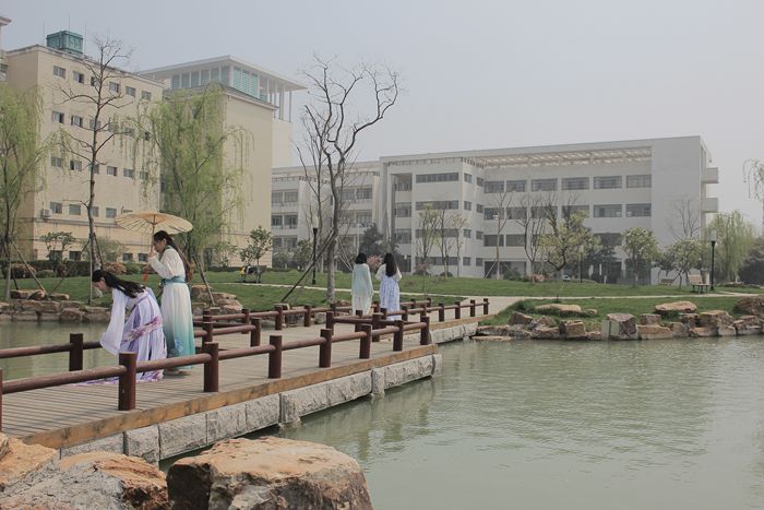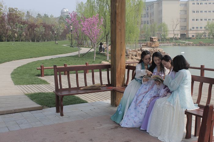 沒錯,那正是學校漢宣社的一群妙齡少女們,他們身著漢服,徜徉在初春的校園內,或歌或詩,或舞或靜,用他們獨有的方式詮釋心底對漢文化的深情,同時,也給我們初春的校園增添了一份濃濃的古典文化韻味。