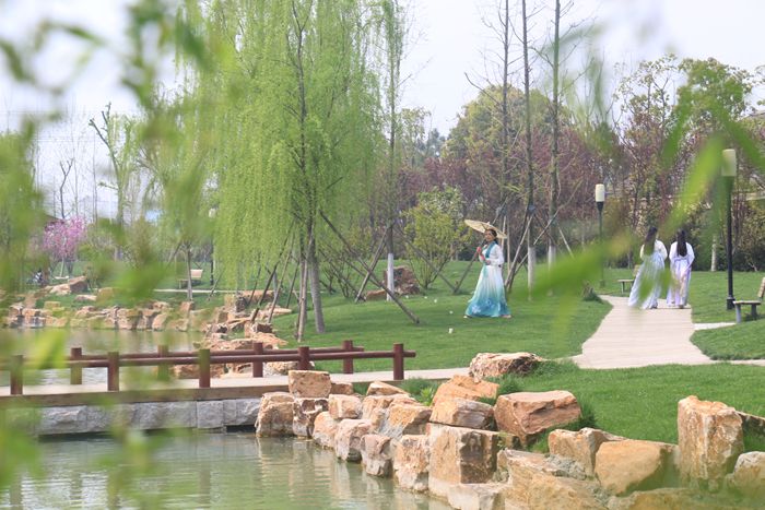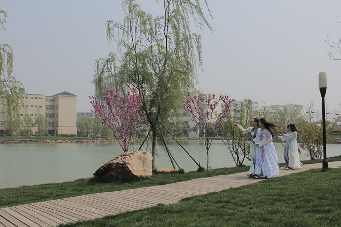 酒不醉人,人自醉。景不黏人,人黏景。曲徑通幽的木板小道,三三兩兩的吸引了校園的學子前來踏春,而漢宣社的姑娘們卻別出心裁,一襲素雅漢服,不必有絲竹管弦相伴,也能在這校園春光中忘我蹁躚起舞,春風掠過他們曼妙的身姿,讓這份美妙融化在校園的春景之中。