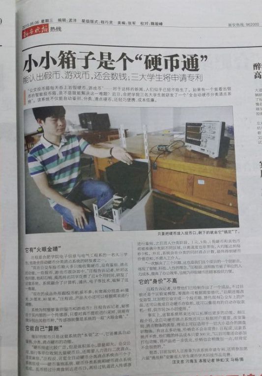 “現在公交車投幣箱大多只能收集硬幣,沒有鑒別、清點的功能,一些假幣、游戲幣混雜其中。”汪程告訴記者,針對這些問題,他和石響、禹芮兩名同學花費了近4個月時間,研發了這套系統。系統融合了計算機、通訊、電子等技術,破解了這一難題。