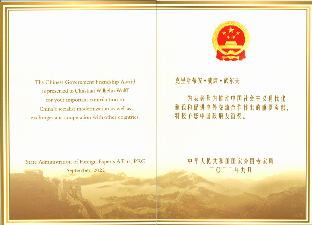 Ehrenprofessor der Universit?t Hefei und ehemaliger Bundespr?sident Christian Wilhelm Wulff gewinnt den Chinese Government Friendship Award 2022