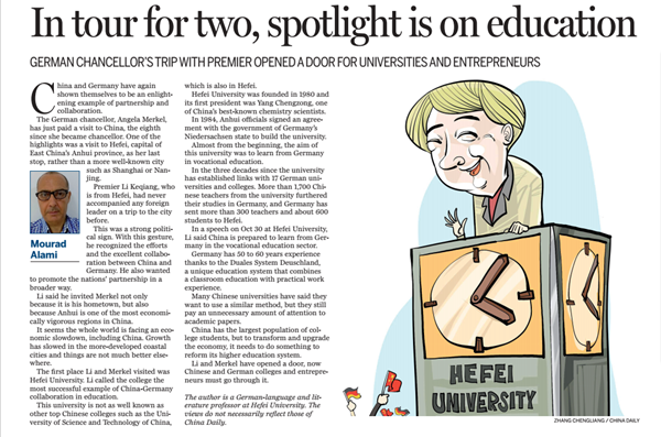 10月30日,國務院總理李克強與德國總理默克爾訪問安徽省會合肥,參觀了合肥學院并共同出席一系列重要活動。11月6日,在合肥學院任教的德國專家穆拉德·阿拉米(Mourad Alami)在中國日報社主辦的《中國日報歐洲版》(China Daily European Weekly)上發表評論文章《中德總理訪問合肥,教育合作成焦點》(In tour for two, spotlight is on education)。