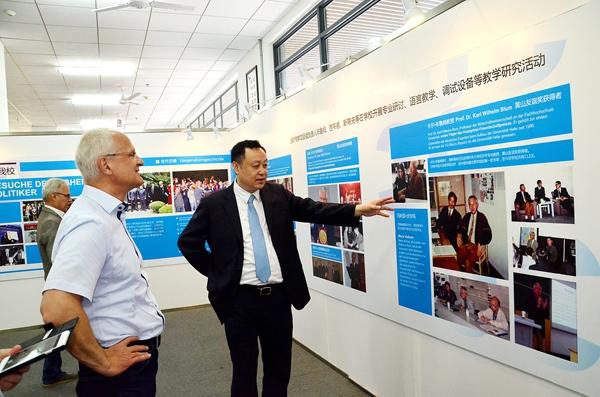Nach der Besprechung besichtigten sie gemeinsam die Ausstellung über den 30-j?hrigen Aufbau der Universit?t Hefei unter der deutsch-chinesischen Kooperation. Daran nahmen unter anderem Herr Jia Feng, Direktor und Herr Sun Jianan, Vizedirektor des International Offices der Universit?t Hefei, Herr Wang Jianbin, Dekan des Instituts für Germanistik und Direktor des Deutschen Forschungszentrums an der Fremdsprachenuniversit?t Beijing, sowie Frau Zhang Xiaohui, Direktorin der Arbeitskomitee für Konfuzius-Instituts teil.