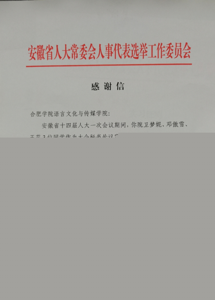 1月11日至17日,我校語言文化與傳媒學(xué)院的衛(wèi)夢妮、鄧傲雪、王蕊三位同學(xué)圓滿完成安徽省第十四屆人民代表大會一次會議的實(shí)習(xí)任務(wù),受到省人大領(lǐng)導(dǎo)的高度評價(jià),并向我校發(fā)來感謝信。