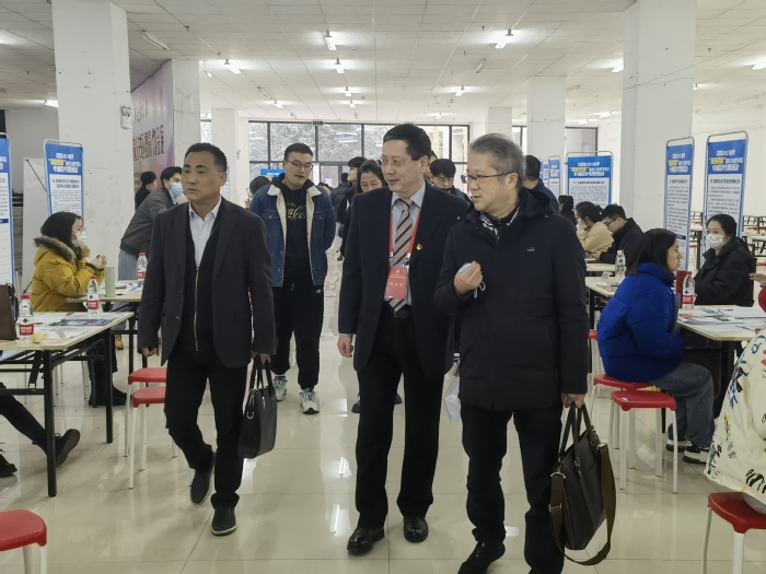 為加強(qiáng)校地合作,推動(dòng)畢業(yè)生高質(zhì)量就業(yè),2月28日,合肥市新站經(jīng)開區(qū)和蕪湖市鳩江區(qū)合肥學(xué)院專場(chǎng)招聘會(huì)在學(xué)校圖書館招聘大廳舉辦。蕪湖市鳩江區(qū)人大常委會(huì)副主任許洋、區(qū)人力資源和社會(huì)保障局局長(zhǎng)肖宗明,安慶市宿松縣勞動(dòng)就業(yè)管理局局長(zhǎng)朱志剛,院長(zhǎng)吳春梅、黨委副書記劉建中到招聘會(huì)現(xiàn)場(chǎng)調(diào)研指導(dǎo)工作,黨委委員、學(xué)生處處長(zhǎng)朱濤陪同。