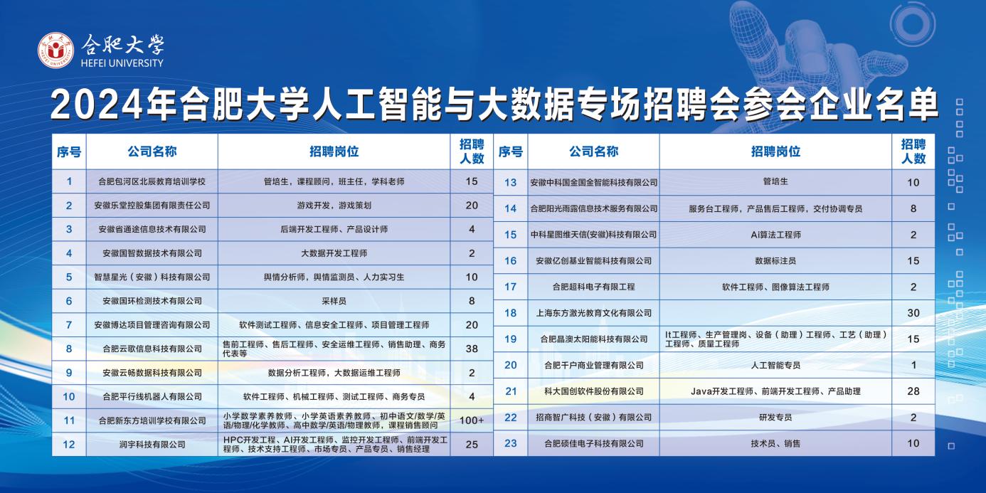 本次招聘會參會單位包含合肥包河區北辰教育培訓學校、安徽國智數據技術有限公司、安徽博達項目管理咨詢有限公司、安徽樂堂控股集團有限責任公司等23家上市公司、龍頭企業、事業單位、研發機構,覆蓋后端開發工程師、產品設計師、大數據開發工程師、軟件測試工程師、信息安全工程師、項目管理工程師、數據分析工程師,大數據運維工程師等67個優質崗位,271個人才需求,涵蓋新能源、新材料、金融、人工智能、大數據技術等多個領域。
