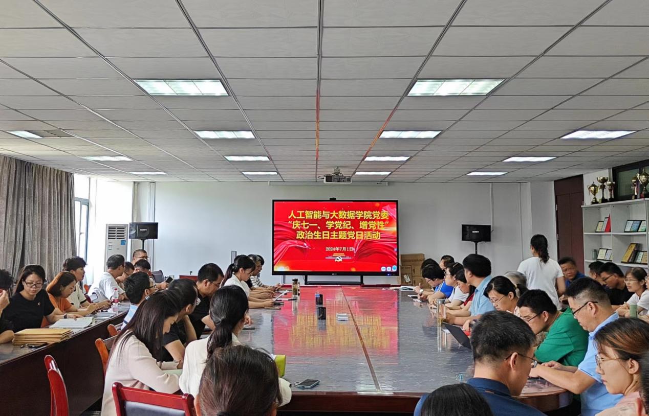 為慶祝中國(guó)共產(chǎn)黨成立103周年,深入開展黨紀(jì)學(xué)習(xí)教育,進(jìn)一步提升黨員對(duì)組織的歸屬感和政治榮譽(yù)感,近期,人工智能與大數(shù)據(jù)學(xué)院黨委精心組織了“慶七一、學(xué)黨紀(jì)、增黨性”的“七個(gè)一”系列活動(dòng)。并于7月1日下午,在36-305召開了學(xué)院全體教工黨員和學(xué)生黨員代表參加的其中“四個(gè)一”活動(dòng)。