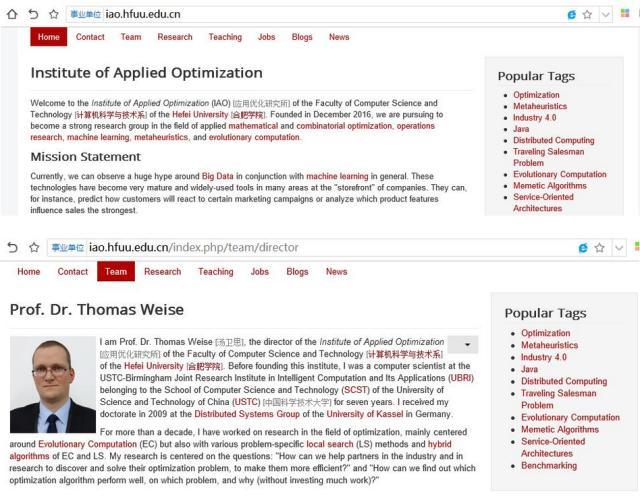 Im Rahmen des Aufbaus der Modelleinrichtung der Bildungskooperation zwischen China und Deutschland, wird der sogenannte ?1251“-Plan schrittweise erarbeitet und implementiert. Dieser sieht vor, unter anderem 100 Akademiker mit Masterabschluss, 20 Doktoren, 50 Professoren und 10 Ingenieure aus Deutschland einzustellen. Bisher ist die Bilanz der Umsetzung erfolgreich: Dank der erheblichen Unterstützung der Regierung auf Provinz- sowie Stadtebene sind in den repr?sentativen Bereichen Verwaltung, Lehre und Praxis bereits einige Fachkr?fte eingestellt worden. Beispielsweise Herr Prof. Dr. Thomas Weise, Gründer des Insitituts für angewandte Optimierung in Zusammenarbeit mit der Fakult?t für Informatik, und Herr Prof. Dr. Falk H?hn, Tr?ger des Freundschaftspreises der Volksrepublik China und Zust?ndiger für Verwaltung und Beratung beim Aufbau der Modell-Plattform und Direktor der ?Deutschen Hochschule Hefei“.