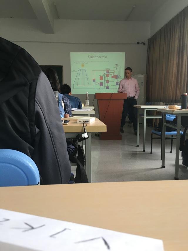 來(lái)自安哈爾特應(yīng)用科學(xué)大學(xué)的施特姆先生(Herr Sturm)是首次來(lái)我校為學(xué)生授課。他以“可再生能源”為主題,以太陽(yáng)能為例,詳細(xì)的為機(jī)械制造及其自動(dòng)化31專業(yè)學(xué)生講解有關(guān)太陽(yáng)能電池,太陽(yáng)能板以及光電效應(yīng)有關(guān)知識(shí)。