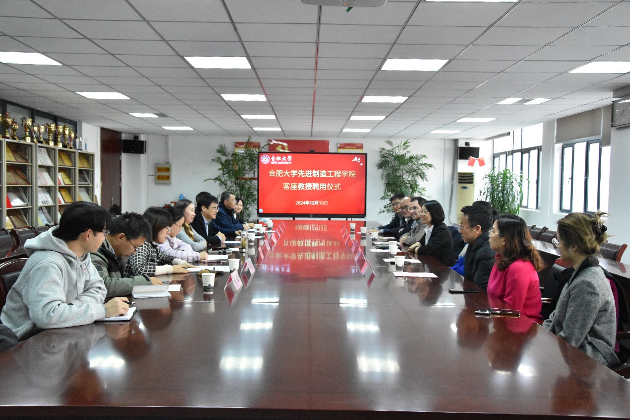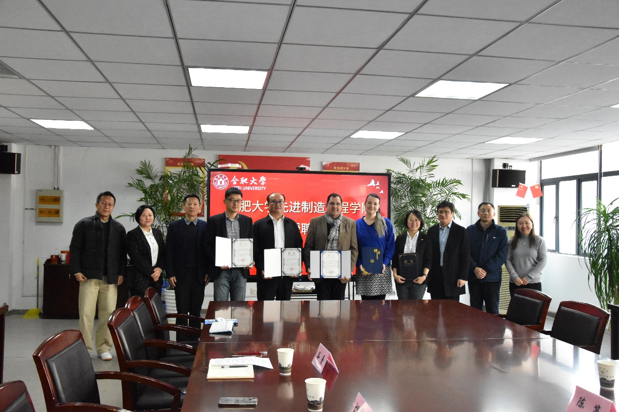 2024年12月13日下午,合肥大學客座教授聘任儀式在我校先進制造工程學院會議室召開。大眾汽車公司大眾安徽質量保證部副總裁馬迪亞斯、大眾安徽效能管理部負責人朱江萍、大眾安徽一廠負責人馬廣翔、大眾安徽預批量中心負責人卡塔妮娜、動力總成測試及預開發經理陳笛博士,合肥大學國際交流合作處處長張慧、大眾學院黨委書記宣躍文、先進制造工程學院黨委書記杜娟、院長胡學友、黨委副書記蔡靈美、智能制造工程系主任谷曼、國際交流合作處科長吳亞男、智能制造工程雙元制專業負責人修磊出席儀式。儀式由先進制造工程學院黨委副書記蔡靈美主持。