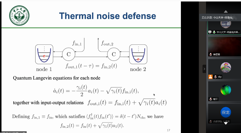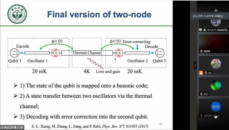 項教授首先對報告內容從總體上進行了概括,并對該報告中涉及到的相關工作的意義進行了闡明。接著項教授從混合量子系統角度出發對如何構造量子網絡進行了詳細的解讀。基于這些鋪墊,項教授對如何實現抗噪聲的完美量子態給與了細致的推導和物理上的理解。