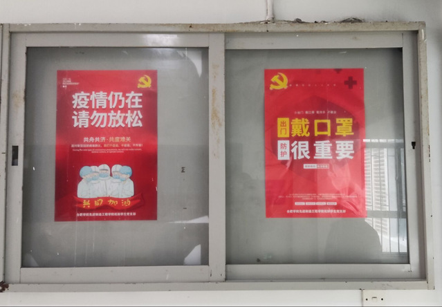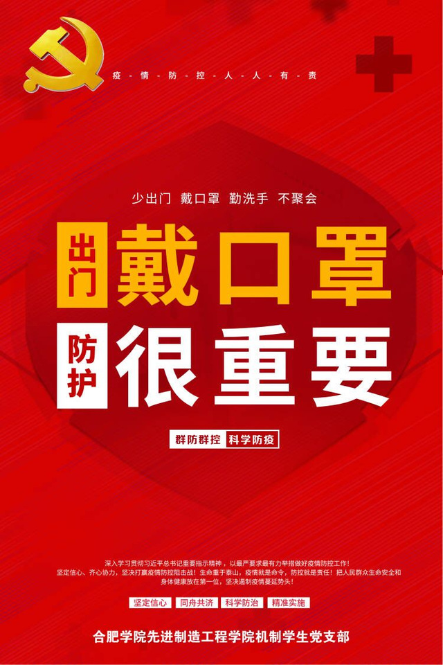 為貫徹落實新冠肺炎疫情防控工作,發揮黨員在疫情防控工作中的先鋒模范作用,2022328日,合肥學院先進制造工程學院機制學生黨支部特舉辦“讓黨旗高高飄揚在云課堂”主題黨日活動40名學生黨員走進二期校區的所有宿舍樓張貼抗疫宣傳海報,向周圍同學們宣傳要遵守疫情防控的各項規定,出門要戴好口罩,注意疫情傳播,閑暇時間不亂走動,并引導廣大青年學生正確理解、積極配合、科學參與疫情防控。