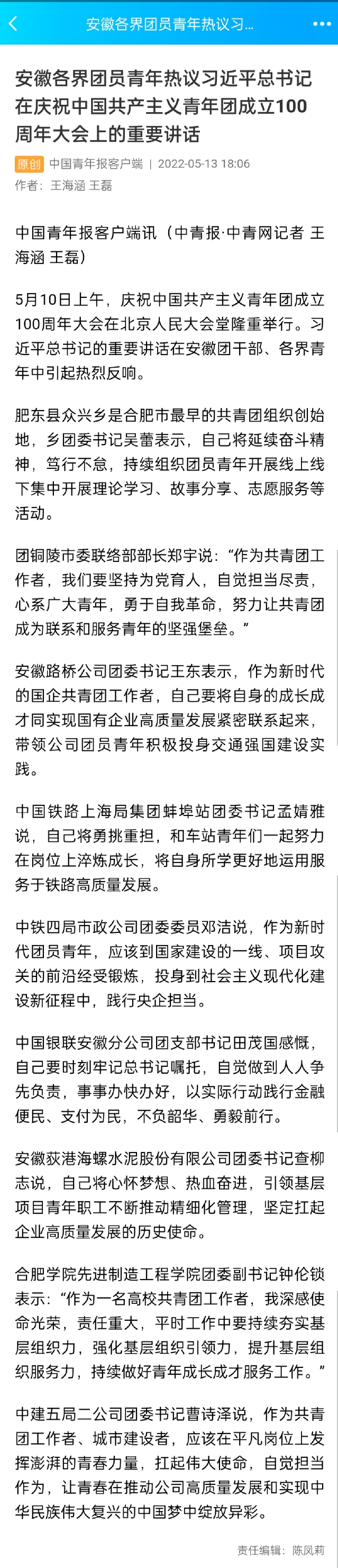 5月10日上午,慶祝中國共產主義青年團成立100周年大會在北京人民大會堂隆重舉行。習近平總書記的重要講話在安徽團干部、各界青年中引起熱烈反響。