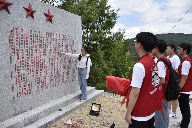 在參觀完紅十一軍第三十二師成立舊址后,調研團隊又徒步前往位于山頂的立夏節起義革命烈士紀念園,重走當年革命烈士走過的紅軍路。沿途中,調研團隊深刻體會到當年紅軍抗戰路途中的不易,也學習了紅軍吃苦在前享樂在后的奮斗奉獻精神。在山頂處指導老師還為團隊成員講解了“最后的黨費”的紅色故事,而在紀念碑前所有調研團隊成員也向長眠的諸位紅軍將士們致以自己最崇高的敬意。