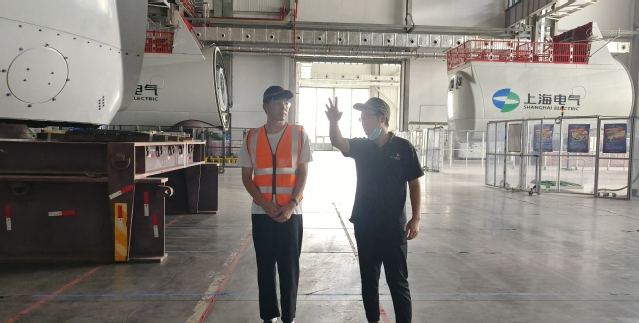 圖為上海電氣風電設備莆田有限公司工作人員帶領調研成員參觀工廠車間
