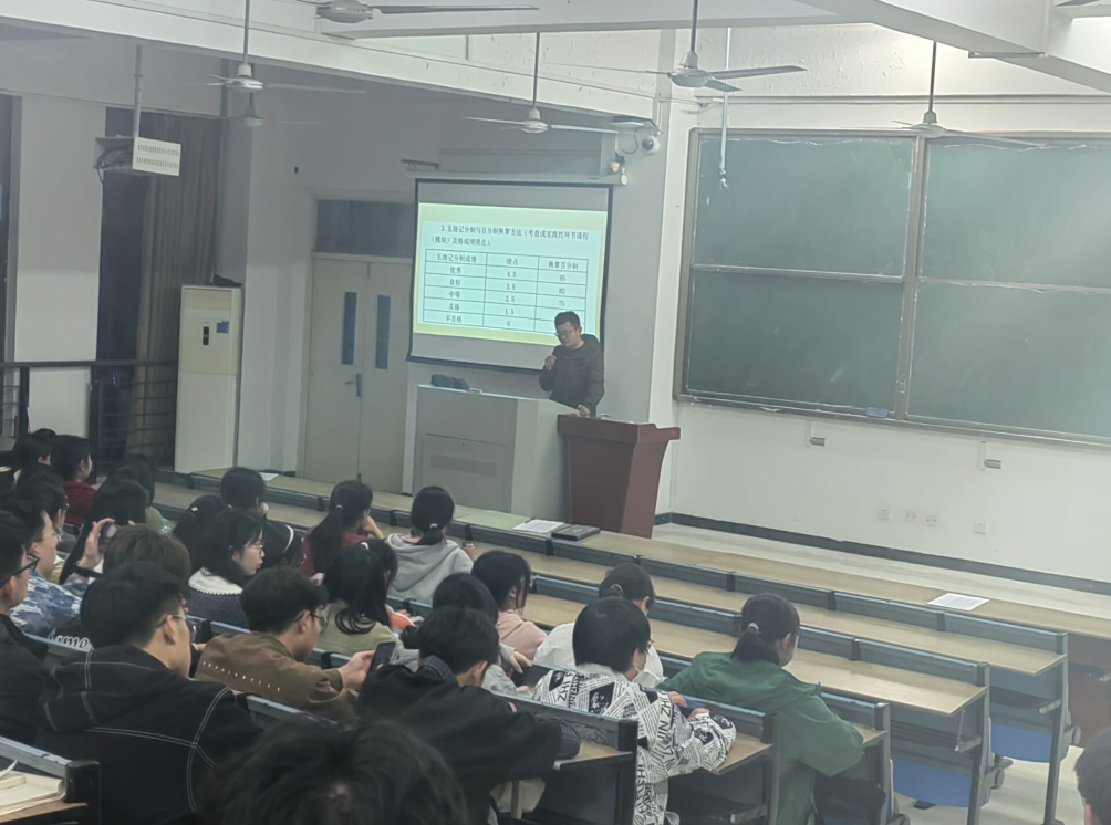 首先,輔導員梅志強介紹了學生手冊中有關學業學習的內容。包括成績、學分、績點,補考、重修,學位授予條件,學業警示與編下,違紀處分,晚自習的重要性等,團員推優與黨員發展等。