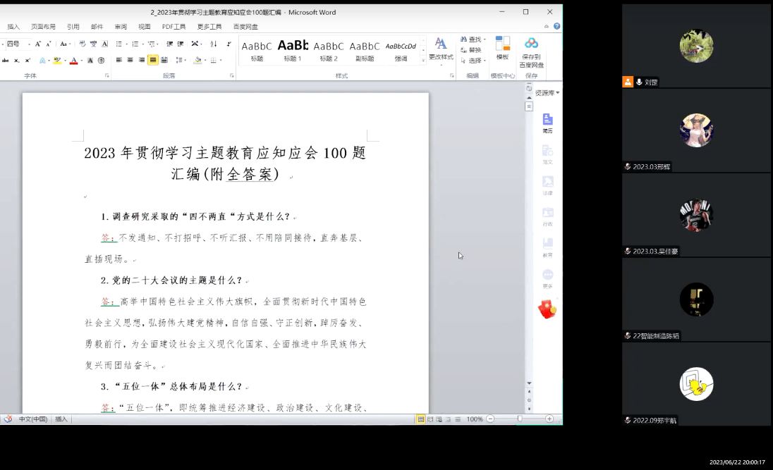 622日晚,智能制造學生黨支部在線上舉行了主題教育6月理論學習會。全體黨員和入黨積極分子參加了學習會。