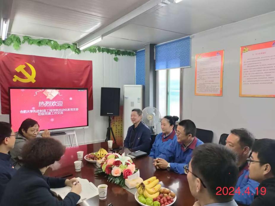 隨后,一行人在公司會議室與公司黨支部進行了深入交流。孫強同志向公司介紹了合肥大學和自動化專業近幾年的發展情況,以及支部開展黨建工作的方法和思路,分享了工作成效。