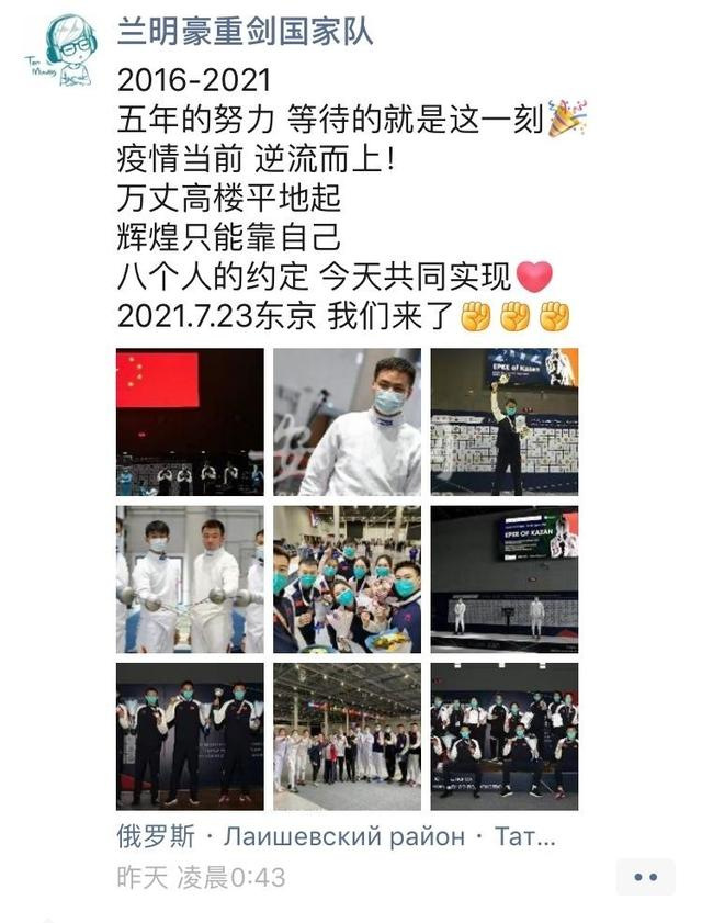 On the same day, the official blog of Chinese Fencing Association forwards a microblog of Chinese Men's and Women's Epee Team, which reads: Five years ago, no one thought highly of Chinese Men's Epee Team ranking 23rd in the world then. Meanwhile, no one imagined that we could finally get the tickets to this summer's Tokyo Olympics, but we had faith in ourselves.