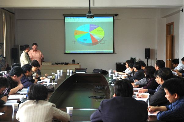 5月25日上午,在院黃山路校區行政樓五樓會議室,德國霍恩教授來我院進行模塊化教學培訓輔導。副院長陳嘯、丁明,教務處處長邵一江、國際教育學院院長魏朱寶、評建辦常務副主任王昆侖及各項目負責人和相關工作人員約40人出席會議,會議由邵一江處長主持,國際教育學院副院長徐剛擔任現場翻譯。     會上,副院長陳嘯說,教務處最近重點抓了模塊化的教學改革工作,從現在起將組織各項目負責人進行數次培訓,讓各負責人直接聆聽德國教授的現場輔導,以提高對專業模塊化人才培養方案制定的水平。