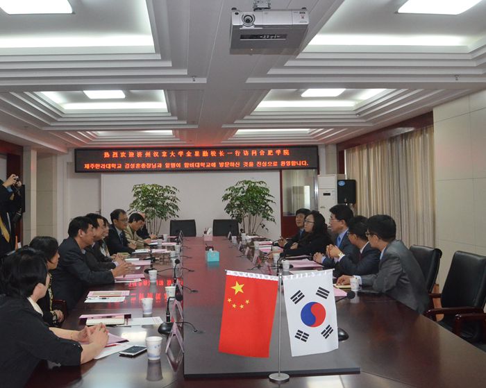 講話中,蔡敬民愉快地回憶了訪問漢拿大學的情景,漢拿大學校園環境優美,教學條件完善,師生熱情,學習氛圍良好。我院留學生對留學漢拿大學的評價也非常高。我院也在逐年改善留學生的學習、生活環境,為韓國在我院留學生創造良好的留學環境。蔡敬民說,合肥是中國發展較快的城市,合肥GDP連續幾年在全國省會城市中領先,合肥是國家六大交通樞紐之一,有便捷的交通條件。2013年安徽省也設立了外國留學生獎學金基金,這一切都有利于我們合作辦學的發展。蔡敬民認為,根據雙方辦學特色和人才培養需求,將拓展合作專業,擴大合作平臺,如動漫、建筑、幼兒教育、護理專業等,同時也將開展產學研合作交流。蔡敬民還介紹了我院牽頭成立的C60高校聯盟,認為這將是我們拓展合作的重要平臺。