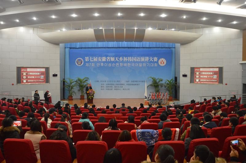 12月12日,由大韓民國駐上海總領事館、中國安徽省教育廳主辦,韓國順天鄉大學與我校承辦、中國-合肥韓國中心、韓大文化交流文化有限公司協辦的第七屆安徽省順天鄉杯韓國語演講大賽在我校圖書館學術報告廳圓滿落幕。韓國駐上海總領事館教育領事李善雨,韓國順天鄉大學總長徐教一,國際教育交流處處長柳炳旭、韓國順天鄉大學中國語教育院長樸炯春教授、我校韓語教授趙誠惠等應邀擔任比賽評委。安徽省教育廳外事處副處長許俊農、我校黨委書記蔡敬民、校長張文兵以及我校外事處、教務處等相關部門負責人出席開幕式。來自安徽省的13所高校的24組學生參加此次比賽。開幕式由校長張文兵主持。