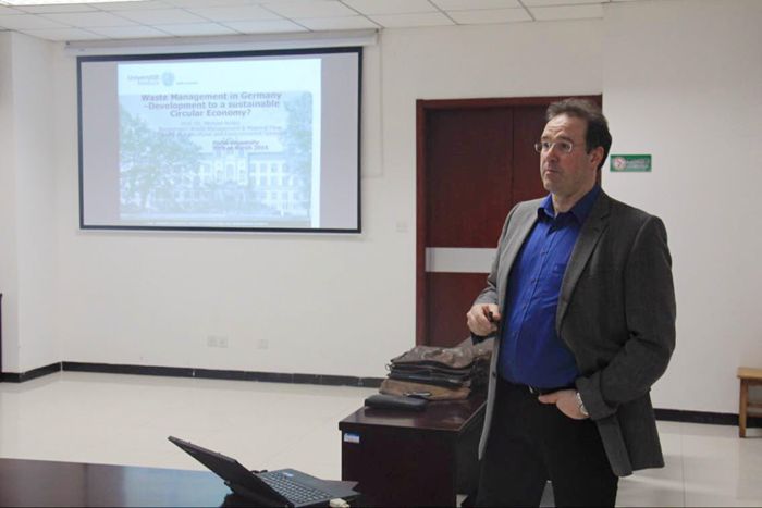 作為我校環(huán)境工程研究生專業(yè)德方教授,萊勒斯為研究生專業(yè)學生完成了廢棄物管理領域的相關講座,詳細介紹了德國廢棄物管理與處理領域相關政策、機制、技術及工程方面知識,并依據(jù)其自2002年以來與我院在華長期項目經(jīng)驗,就中國廢棄物處理領域的相關問題提出了合理建議。講座后,萊勒斯還與學生們就彼此關心的環(huán)境話題,以及我校環(huán)境工程專業(yè)研究生赴德游學和繼續(xù)攻讀博士學位等事宜進行了介紹和交流。